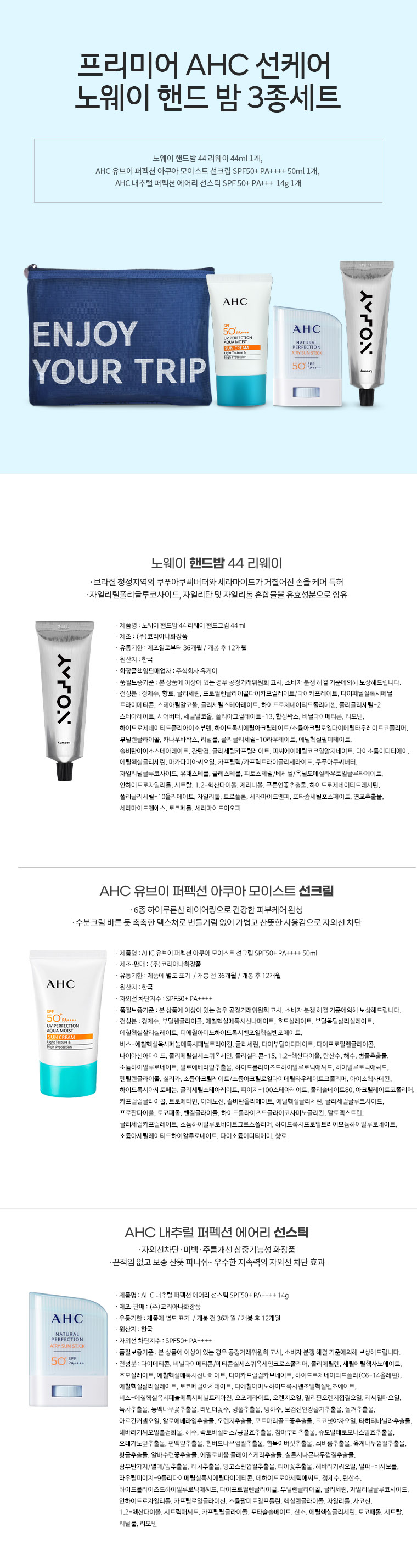AHC ³»Ãß·² ÆÛÆå¼Ç ¿¡¾î¸®¼±½ºÆ½ 14g SPF 50+ 1P + ¾ÆÄí¾Æ ¸ðÀ̽ºÃÄ ¼±Å©¸² 50ml 1P + ³ë¿þÀÌ ÇÚµå¹ã 44ml 1P